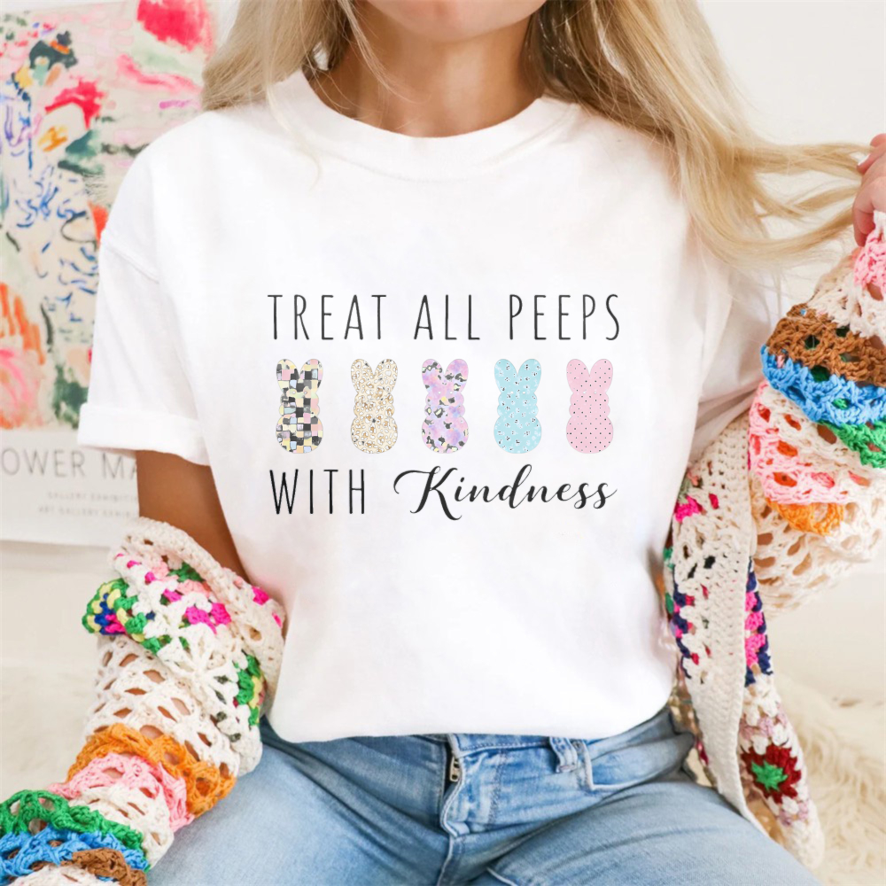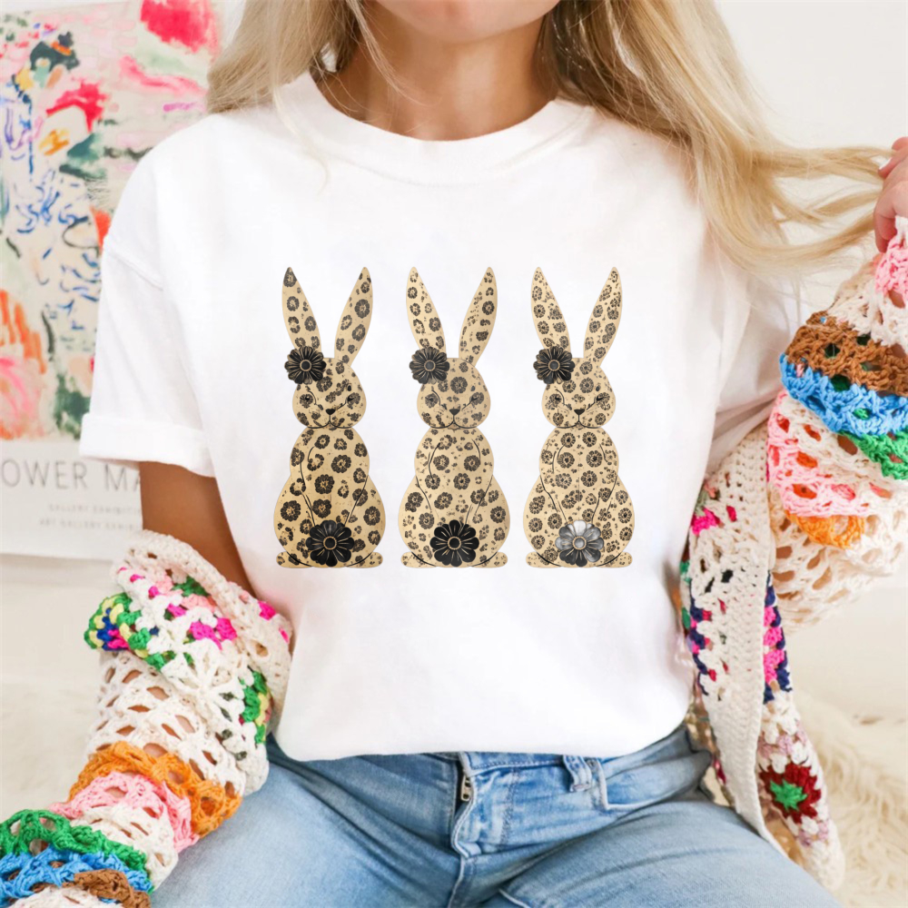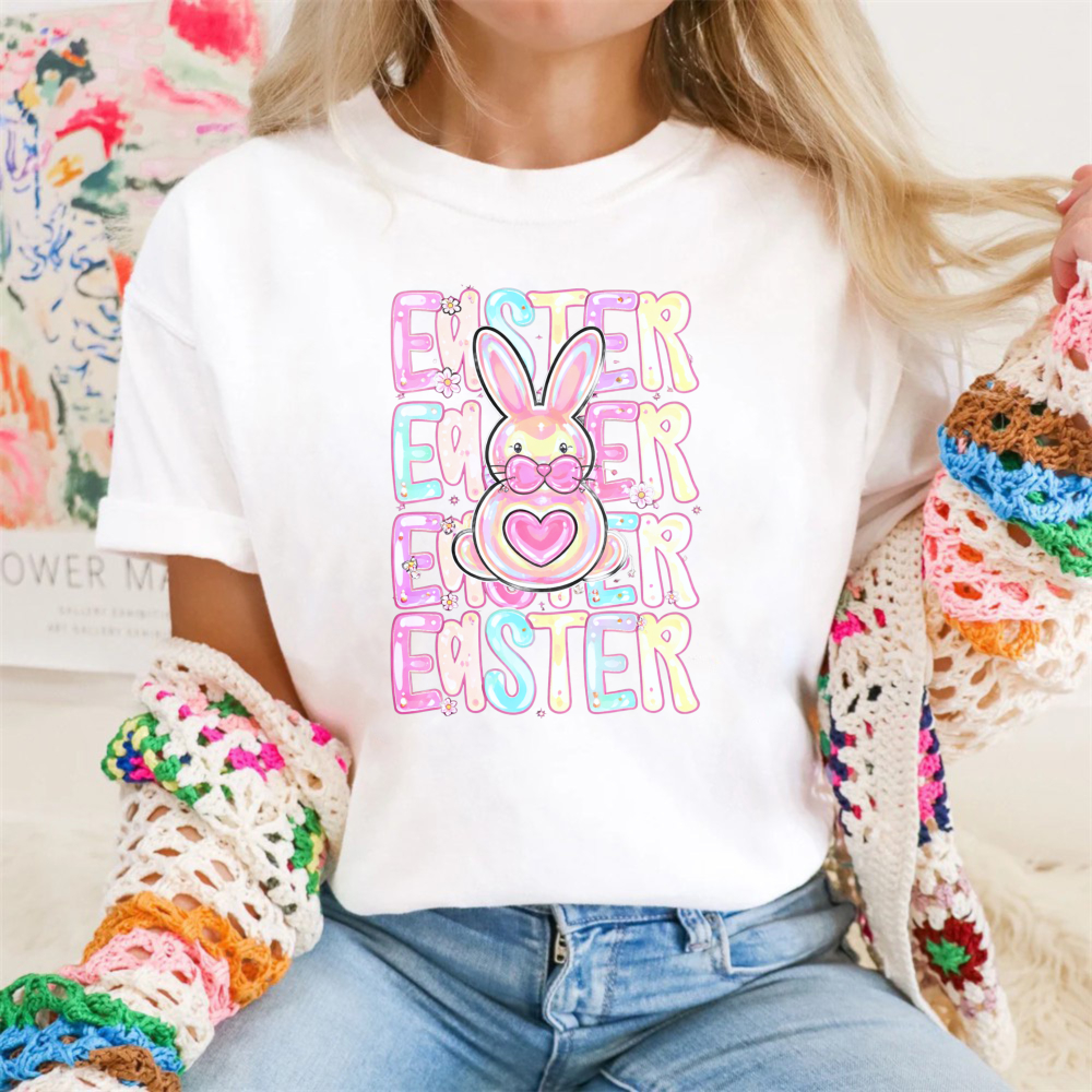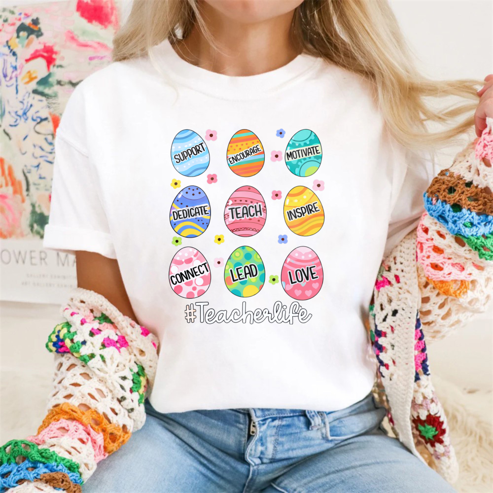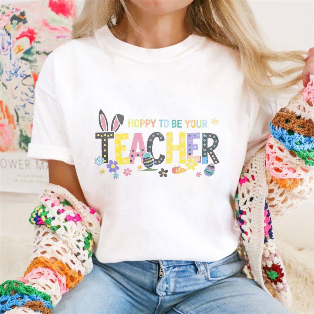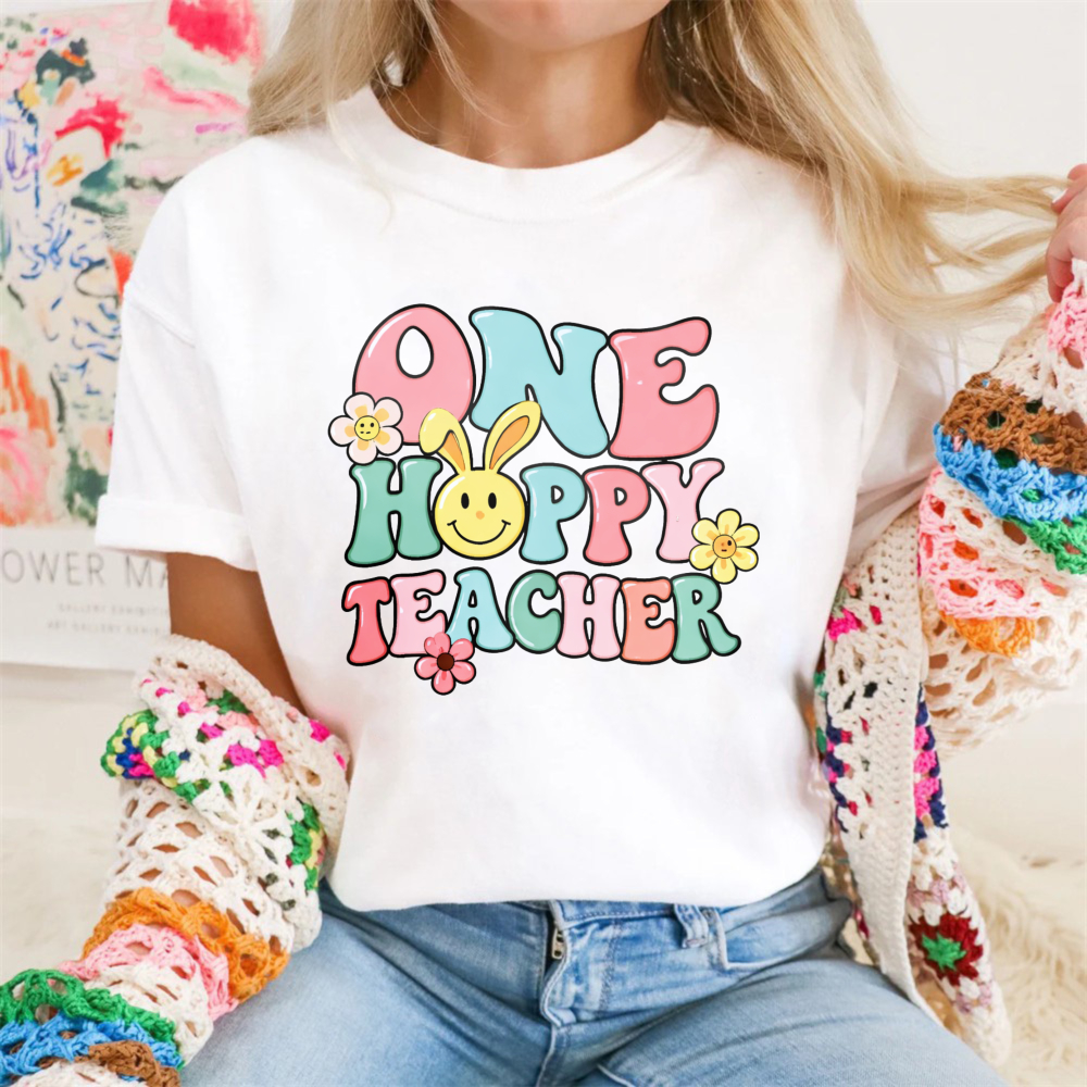 Clottya One Happy Teacher With Bunny And Flowers T-shirt Spring Summer Casual Wear$22.99 USD$39.99 USD