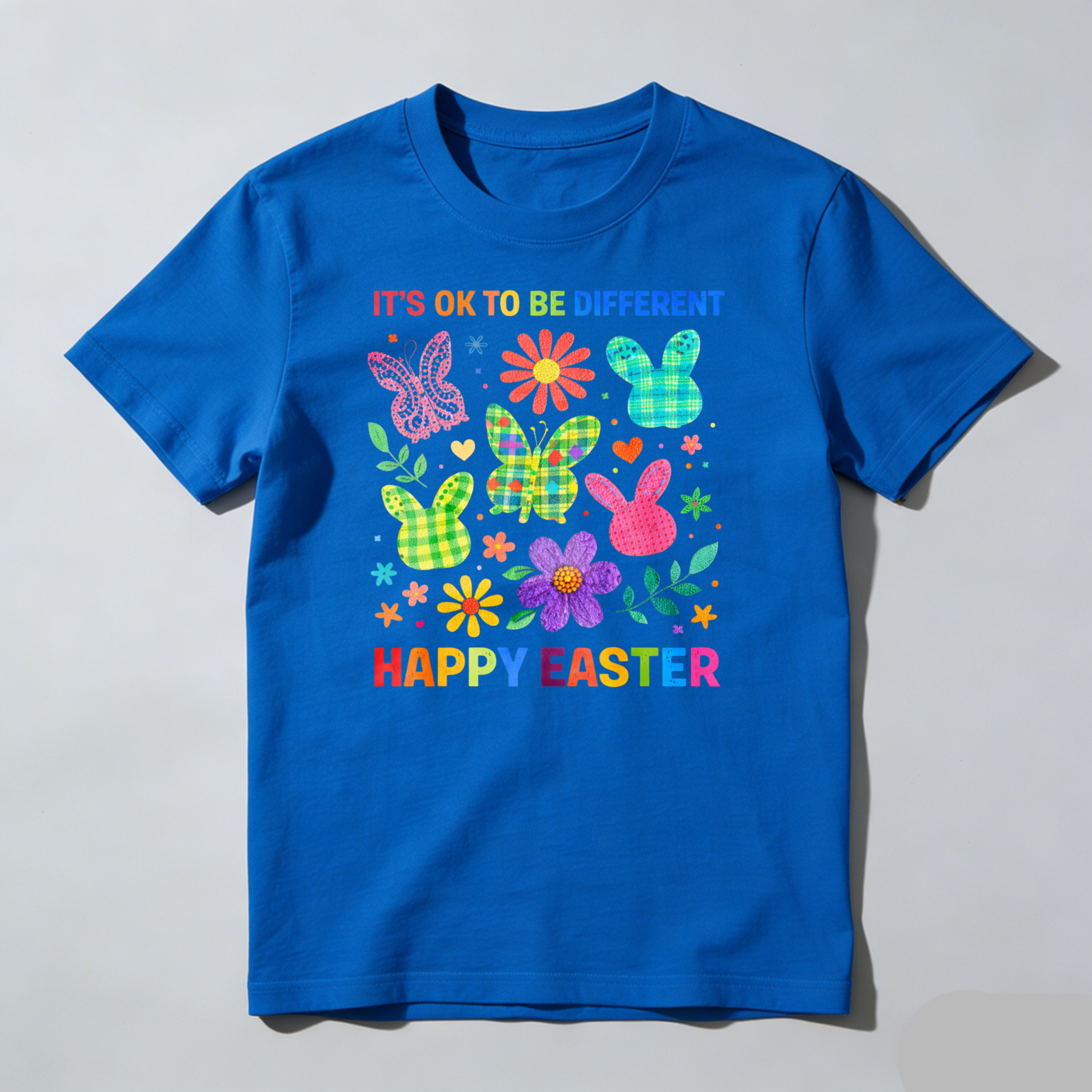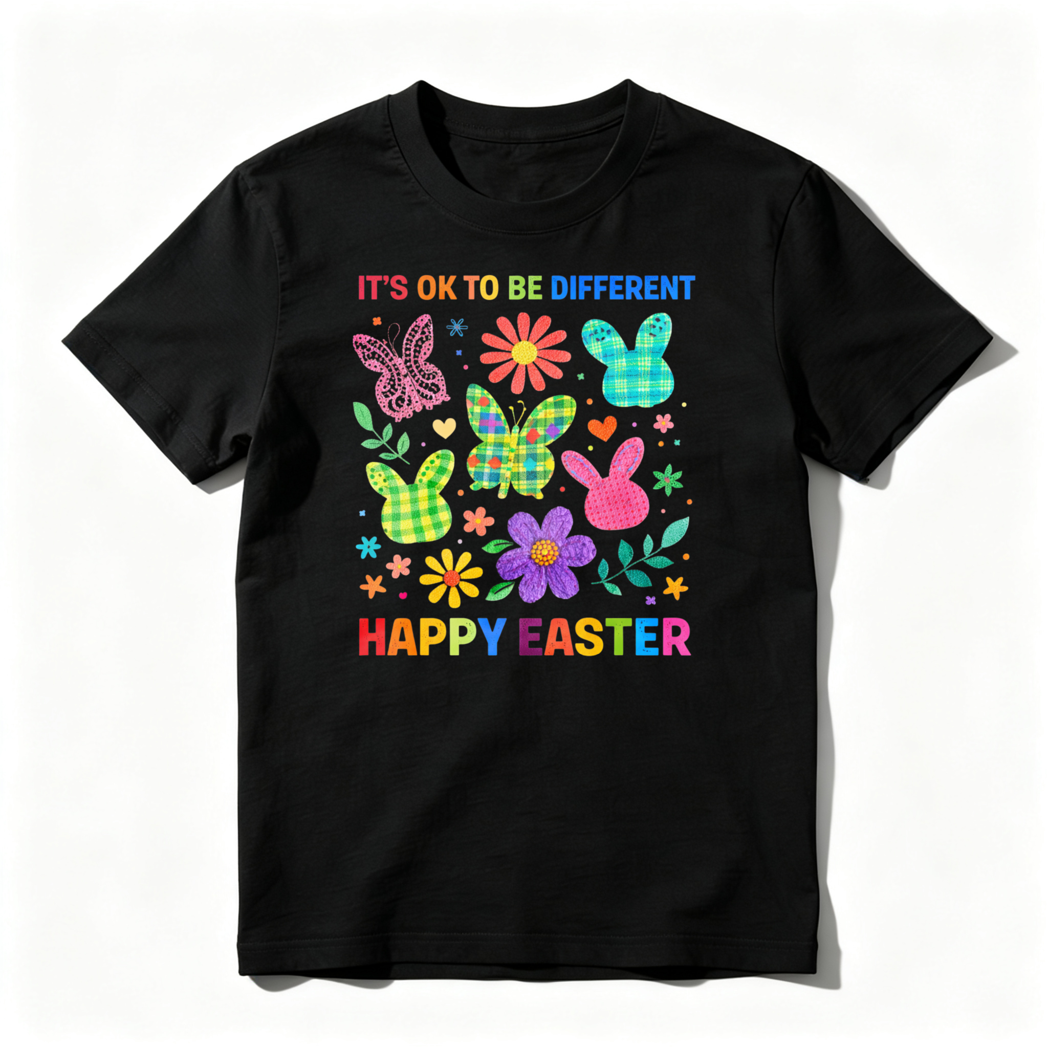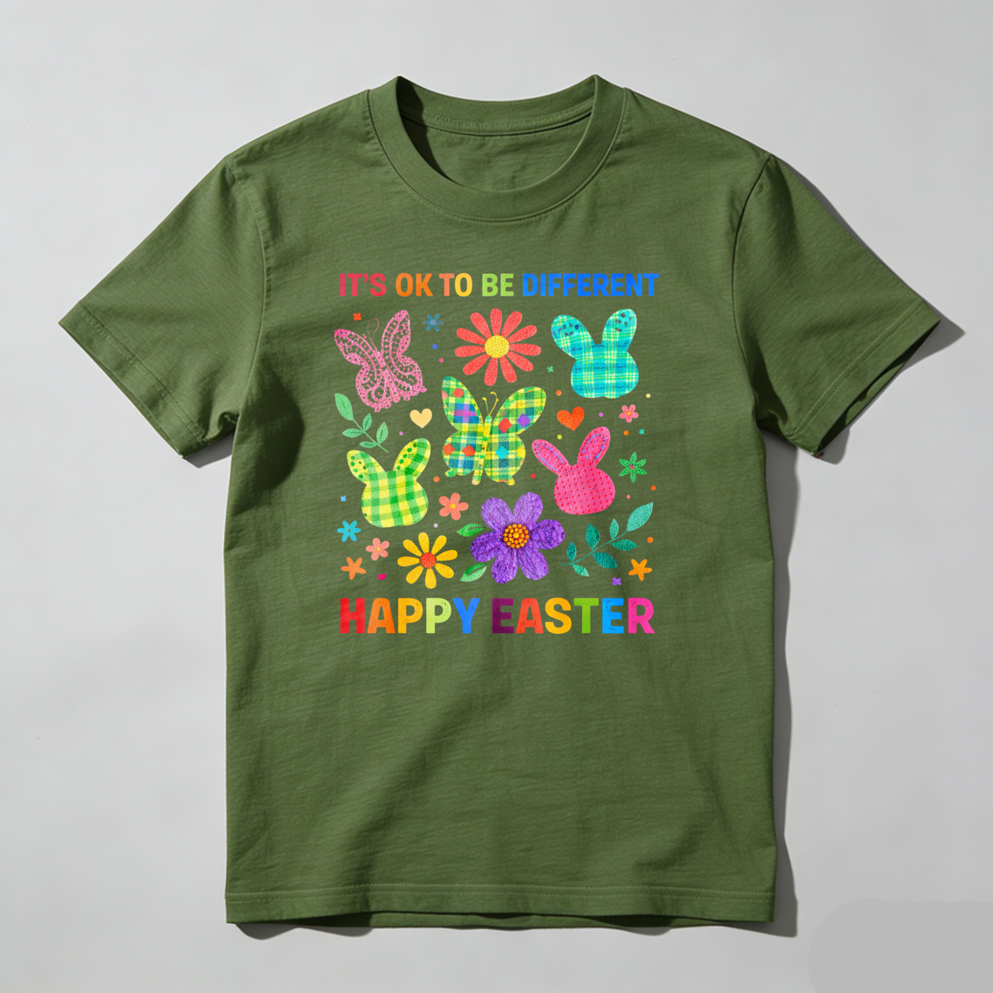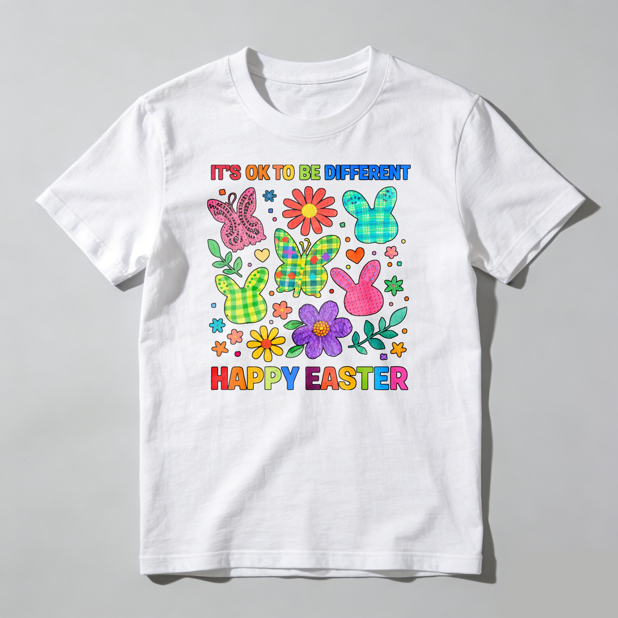 Clottya Colorful Easter Bunny And Flowers Pattern With Its Ok To Be Different Text T-shirt Spring Celebration