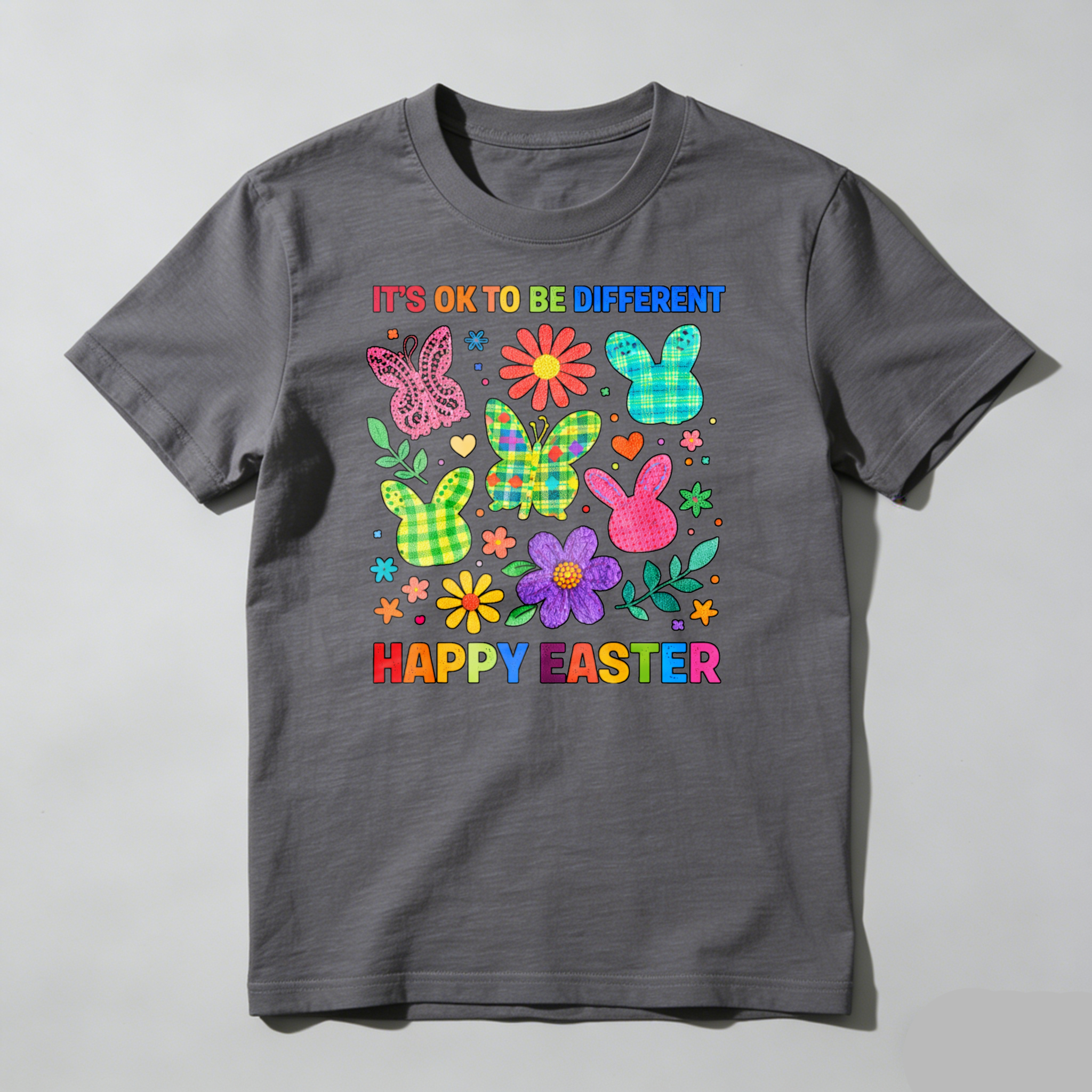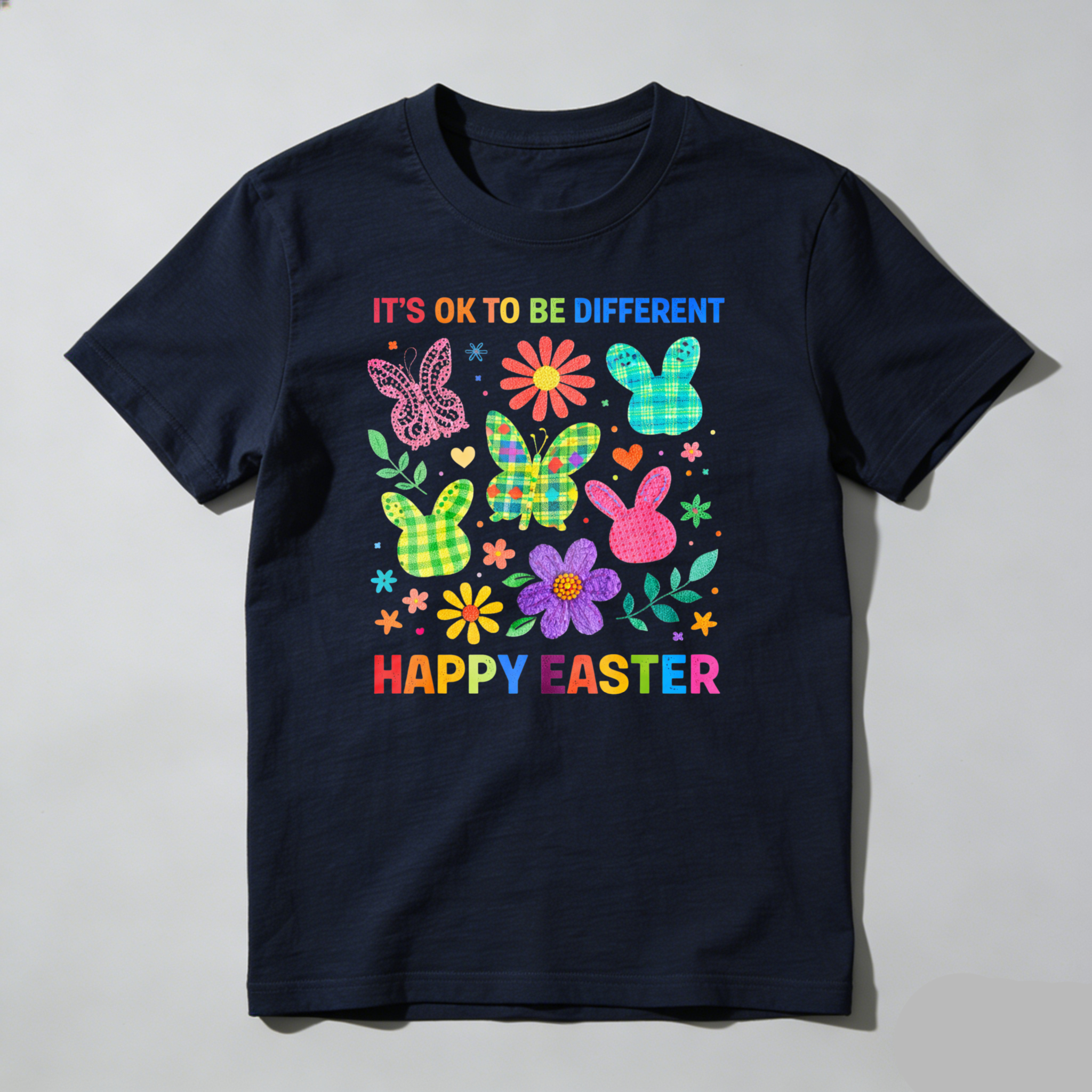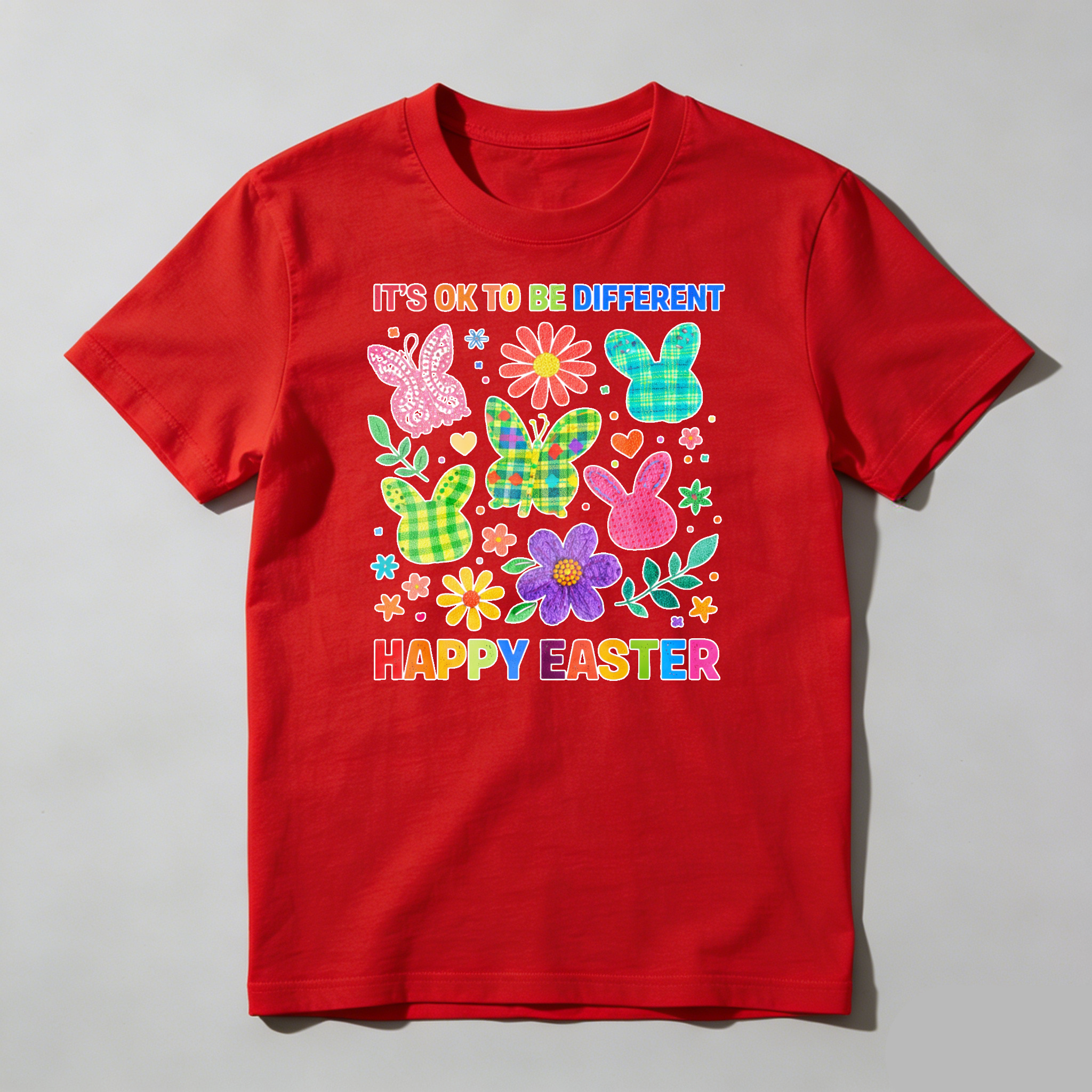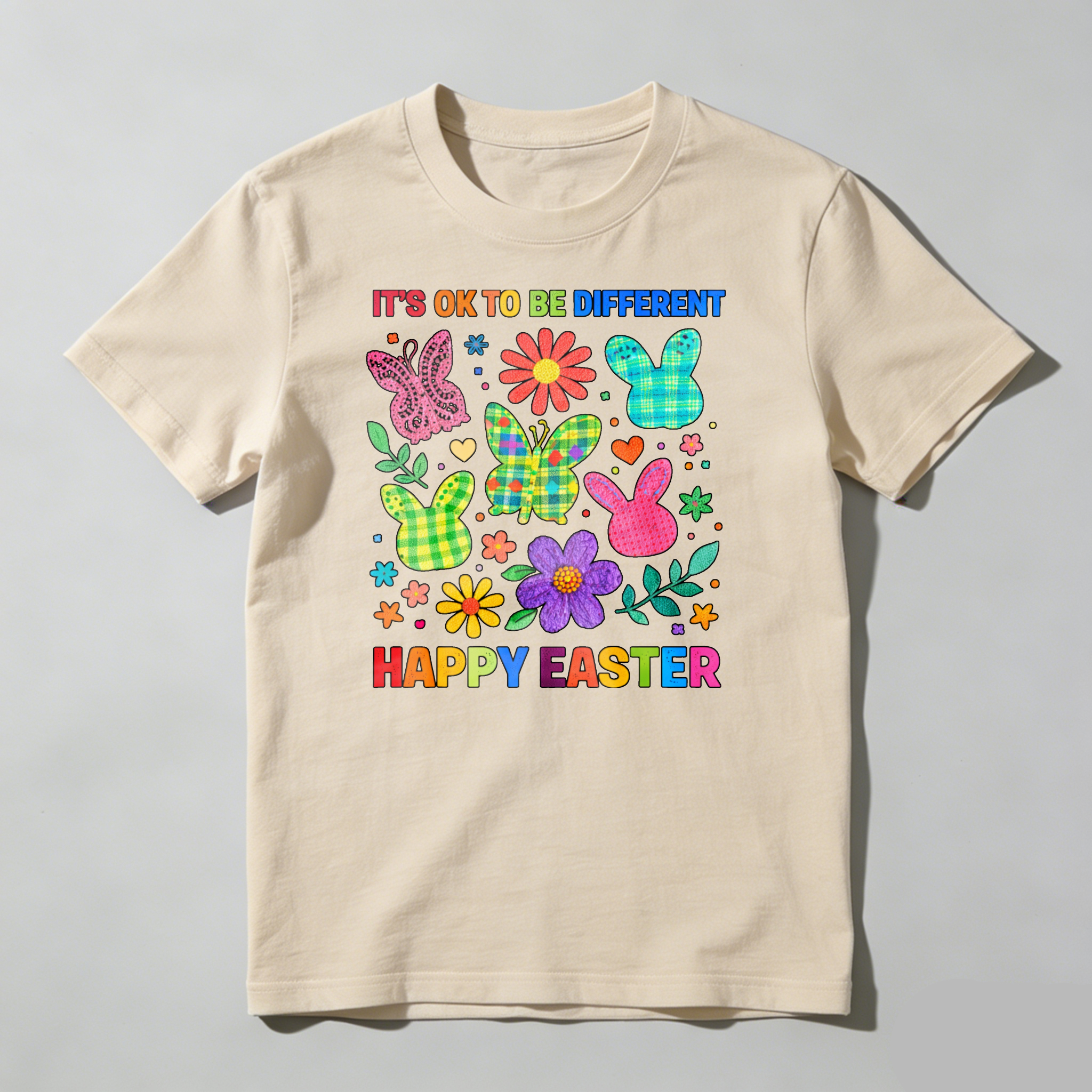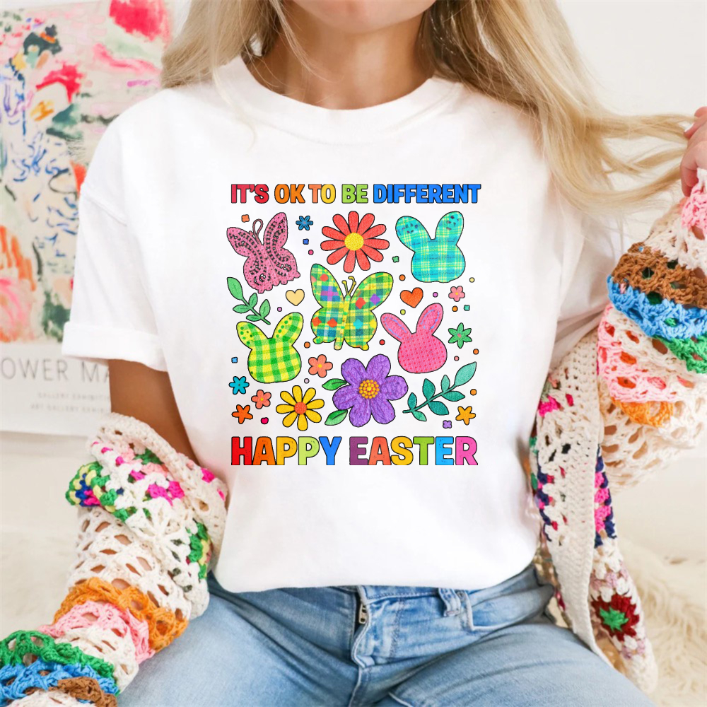Clottya Colorful Easter Bunny And Flowers Pattern With Its Ok To Be Different Text T-shirt Spring Celebration