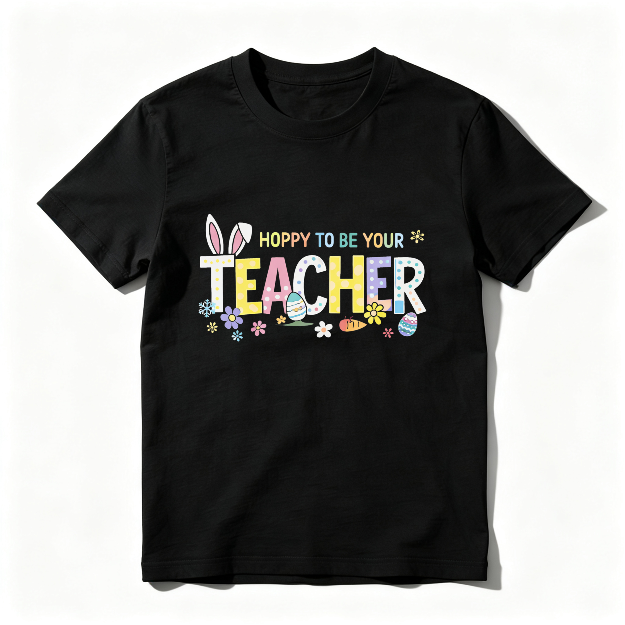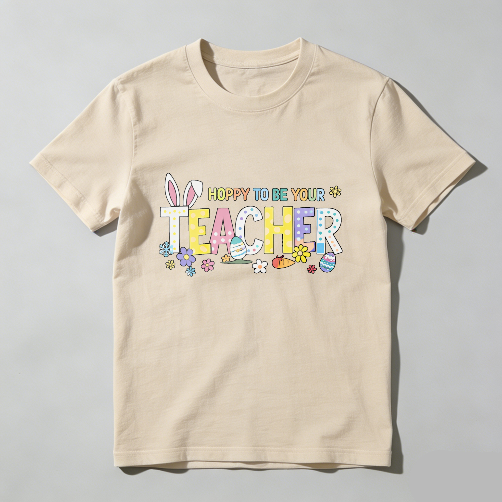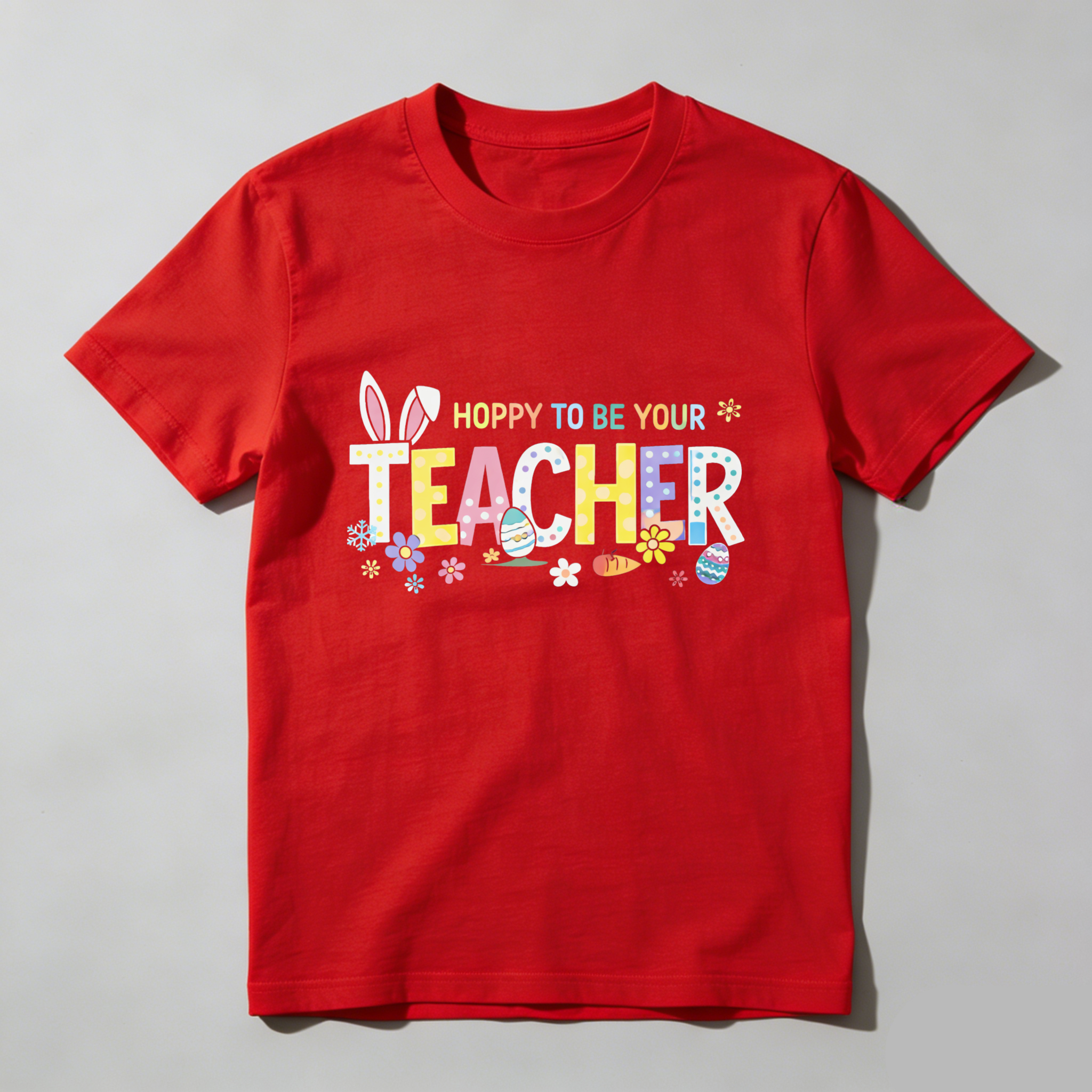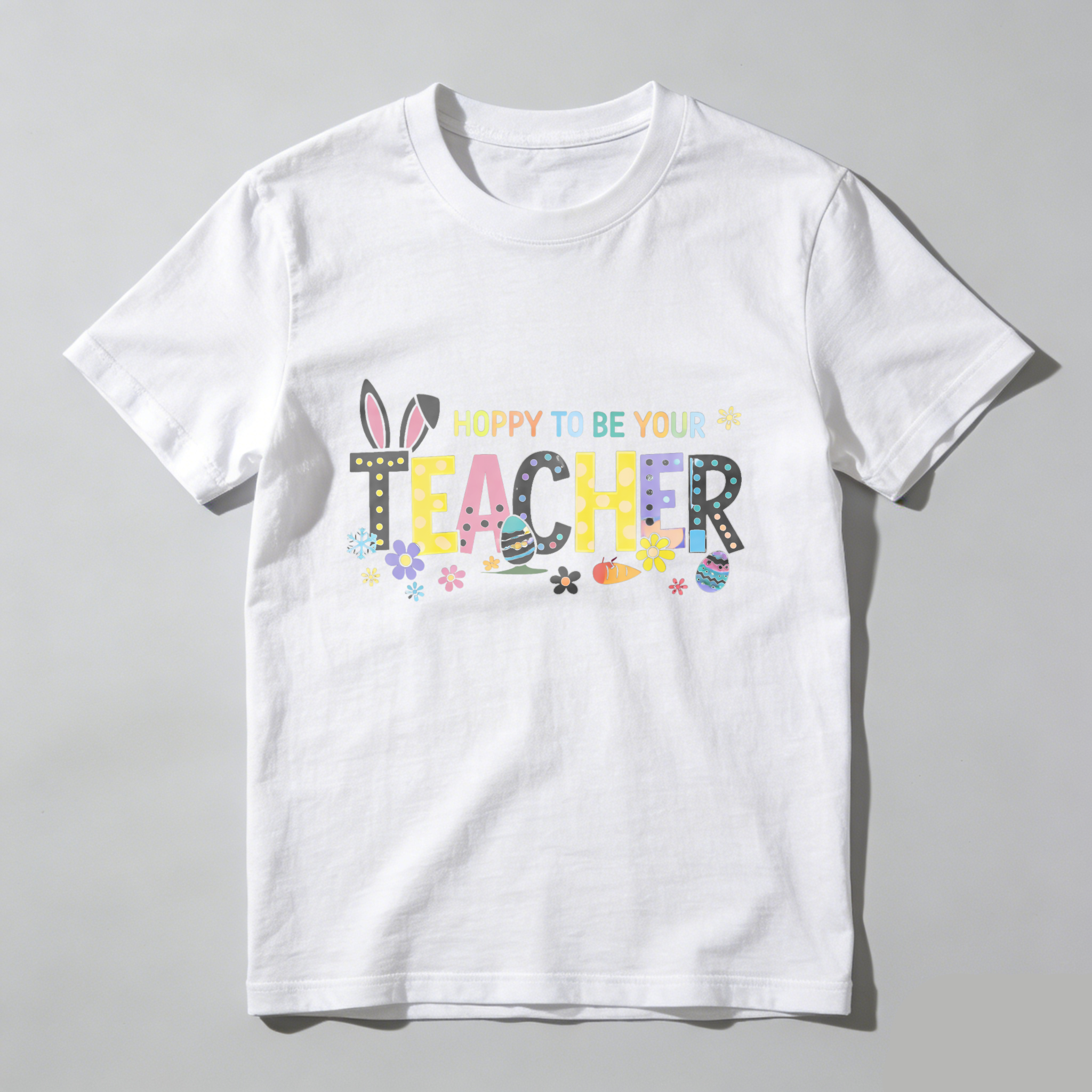 Clottya Easter Bunny And Eggs Pattern With Hoppy To Be Your Teacher Text T-shirt Spring And Easter Season
